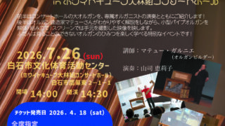 音の魔法パイプオルガンのひみつinホワイトキューブ大林組コンサートホール 出演者 講師:マテュー・ガルニエ(オルガンビルダー) 演奏:山司 恵莉子 期日 令和8年7月26日(日) 開場 14:00 開演 […]