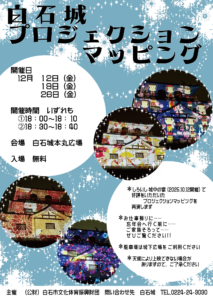 白石城プロジェクションマッピング 先日のしろいし城中の宴で好評をいただいたプロジェクションマッピングを再演します 各日2回ずつ上映しますので、ぜひご覧ください 開催日時 12月12日(金曜日)、19日(金曜日)、26日(金曜日) いずれも 1回目 午後6時から午後6時10分 2回目 午後6時30分か ...