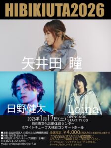 HIBIKIUTA2026 出演者 矢井田瞳 日野健太 Leina 期日 令和7年1月17日(土) 開場 16:30 開演 17:00 チケット 全席指定 4,000円(税込) ※未就学児入場不可 ※当日500円増し 一般発売日 令和7年11月20日(木) プレイガイド ホワイトキューブ 事務所窓 ...