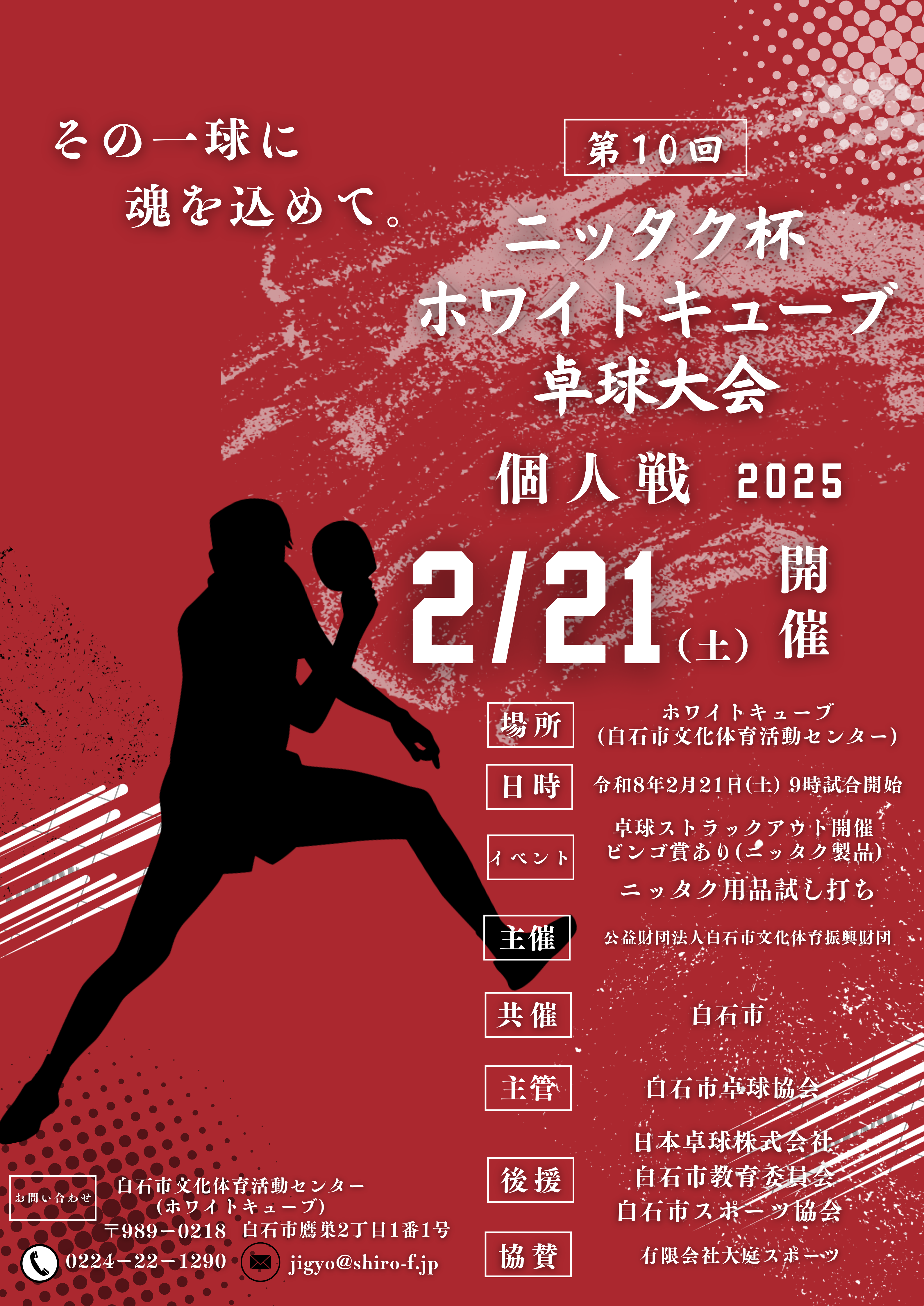 2026年1月6日 / 最終更新日時 : 2026年1月6日 whitecube 【*団体名入力(男子・女子卓球部)*】第10回ニッタク杯ホワイトキューブ卓球大会(中学2年生以下個人戦)_申込用紙 【*団体名入力(男子・女子卓球部)*】第10回ニッタク杯ホワイトキューブ卓球大会(中学2年生以下個人戦)_申込用紙